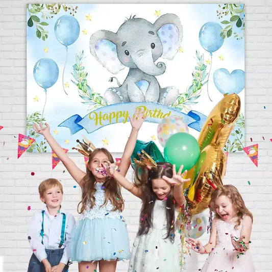 Elephant Birthday Party Banner – Blue Balloons and Happy Birthday Backdrop for Boys