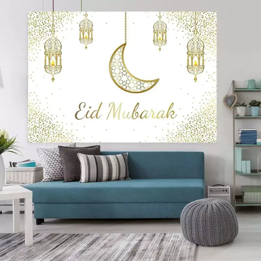 Eid Mubarak Backdrop – Gold Crescent Moon and Lanterns Party Banner