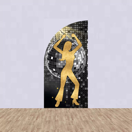 Disco-Themed Birthday Arch Backdrop – Gold Silhouettes and Mirror Balls for Adult Party