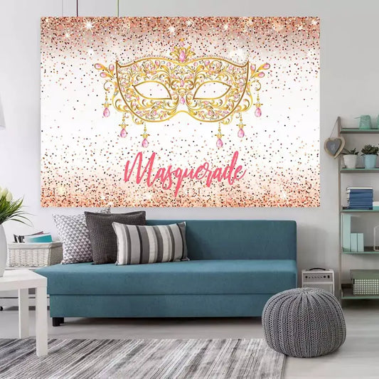 Glamorous Masquerade Backdrop – Golden Mask and Rose Gold Glitter for Party Decor