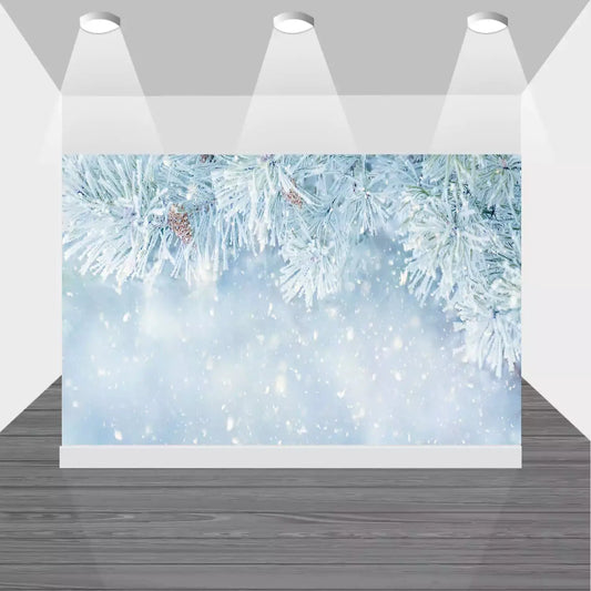 Frosted Pine Winter Backdrop – Snowy Branches and Pinecones for Holiday Decor