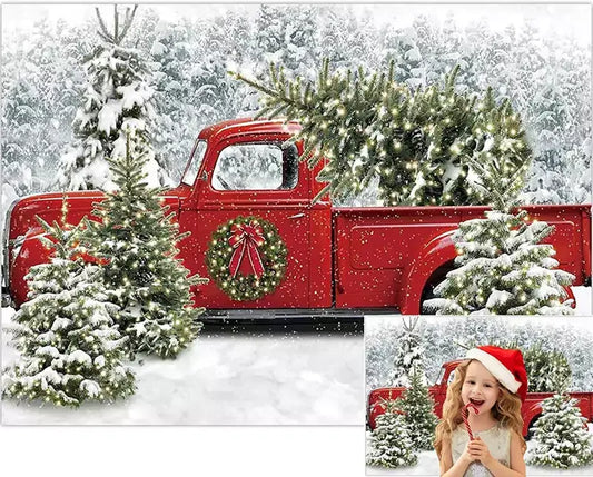 Red Truck Christmas Backdrop – Vintage Holiday Scene with Trees and Snow