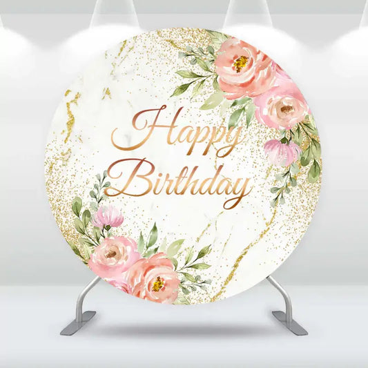 Sensfun Gold Glitter Happy Birthday Round Backdrop Cover Flower Marble White Gold Wedding Circle Background Cylinder Covers