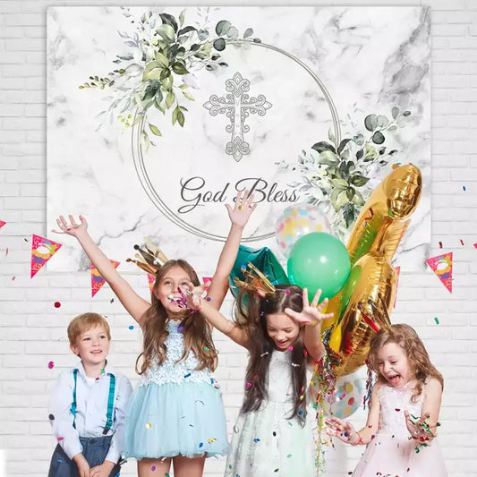Sensfun First Holy Communion Backdrops Party Decoration Cake Table Banner Silver Cross Marble Green Leaves God Bless Photography Backgrounds