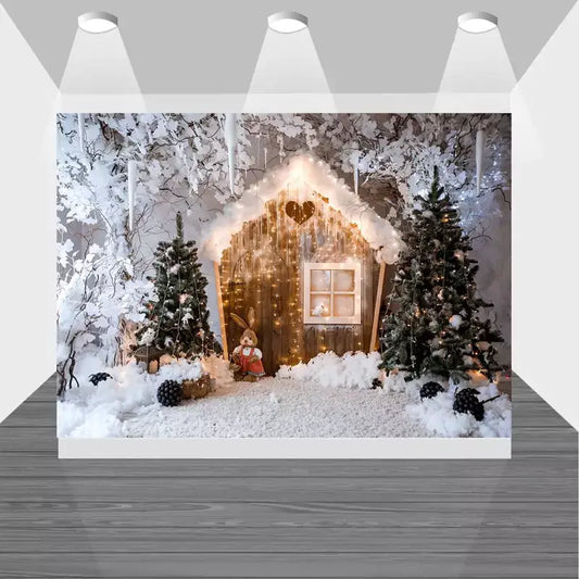 Winter Wonderland Cabin Backdrop – Rustic Christmas Scene with Lights and Snow
