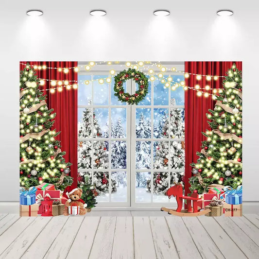 Christmas Window Scene Backdrop – Holiday Party Banner with Trees and Snow View