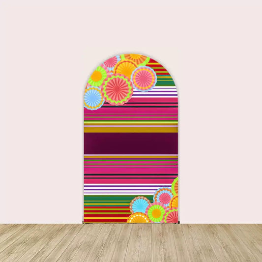 Mexican Fiesta Arch Backdrop Set with Colorful Serape Stripes Flowers and Papel Picado