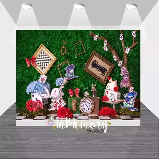 Alice in Wonderland Party Backdrop – Mad Hatter Tea Party Banner with Teacups and Cards