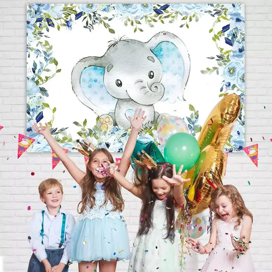 Blue Floral Elephant Birthday Backdrop – Baby Boy Party Banner with Flowers
