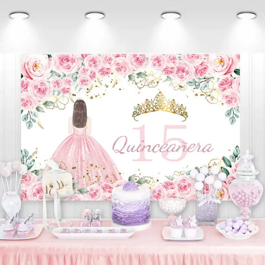 15th Birthday Party Backdrop – Quinceañera Theme with Floral and Princess Dress