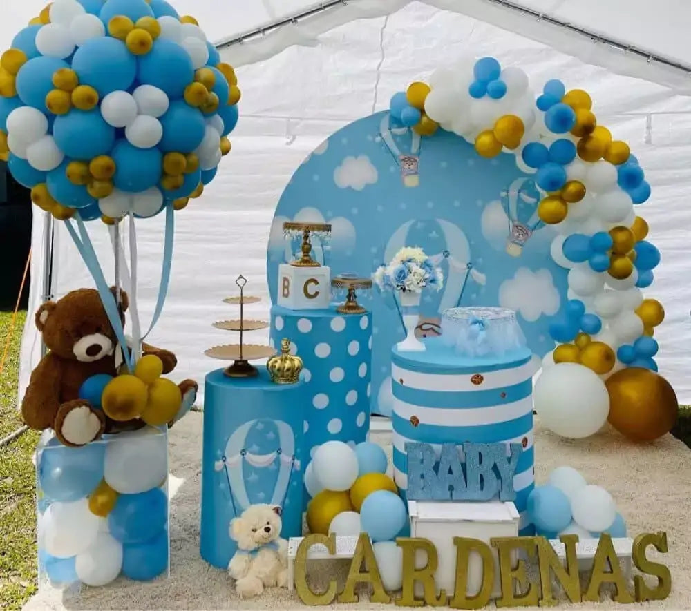 Create an enchanting party setting with this blue hot air balloon-themed round backdrop featuring adorable teddy bears. Perfect for baby showers, kids' birthday parties, and other whimsical events