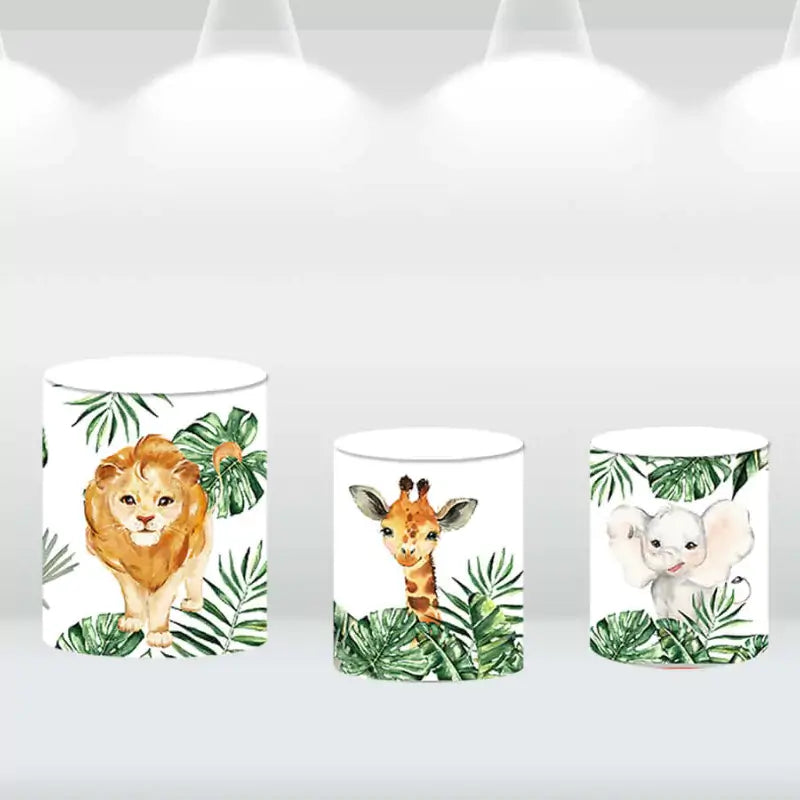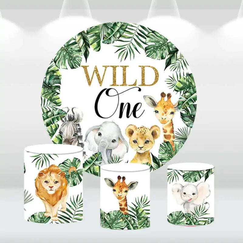Create a wild jungle-themed first birthday party with our 'Wild One' backdrop and cylinder cover set featuring adorable safari animals. Perfect for memorable celebrations.