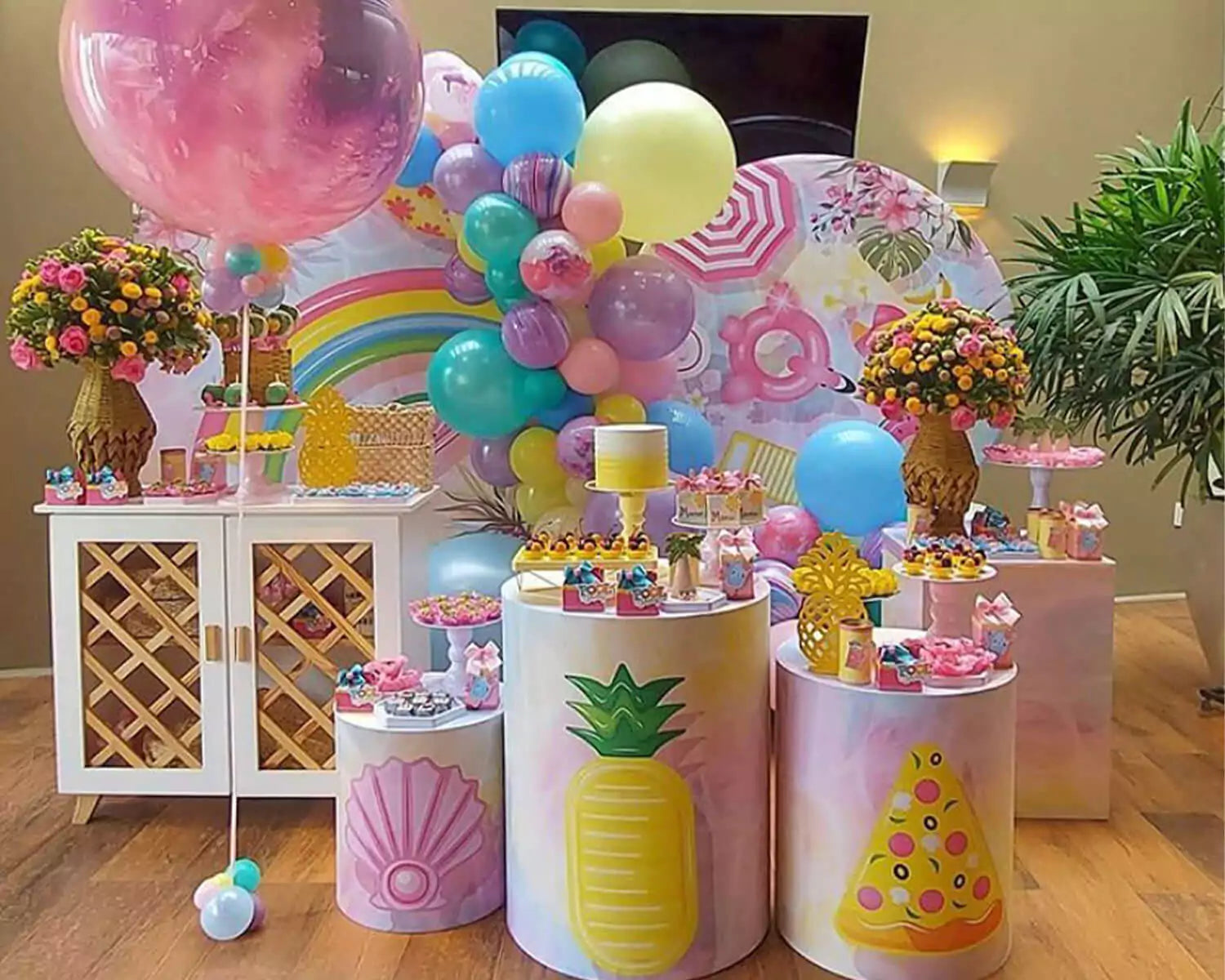 Get ready for a summer of fun with this pool party-themed round backdrop. Featuring tropical vibes with floaties, umbrellas, and flowers, this backdrop is perfect for pool parties, beach-themed events, and summer birthday celebrations.